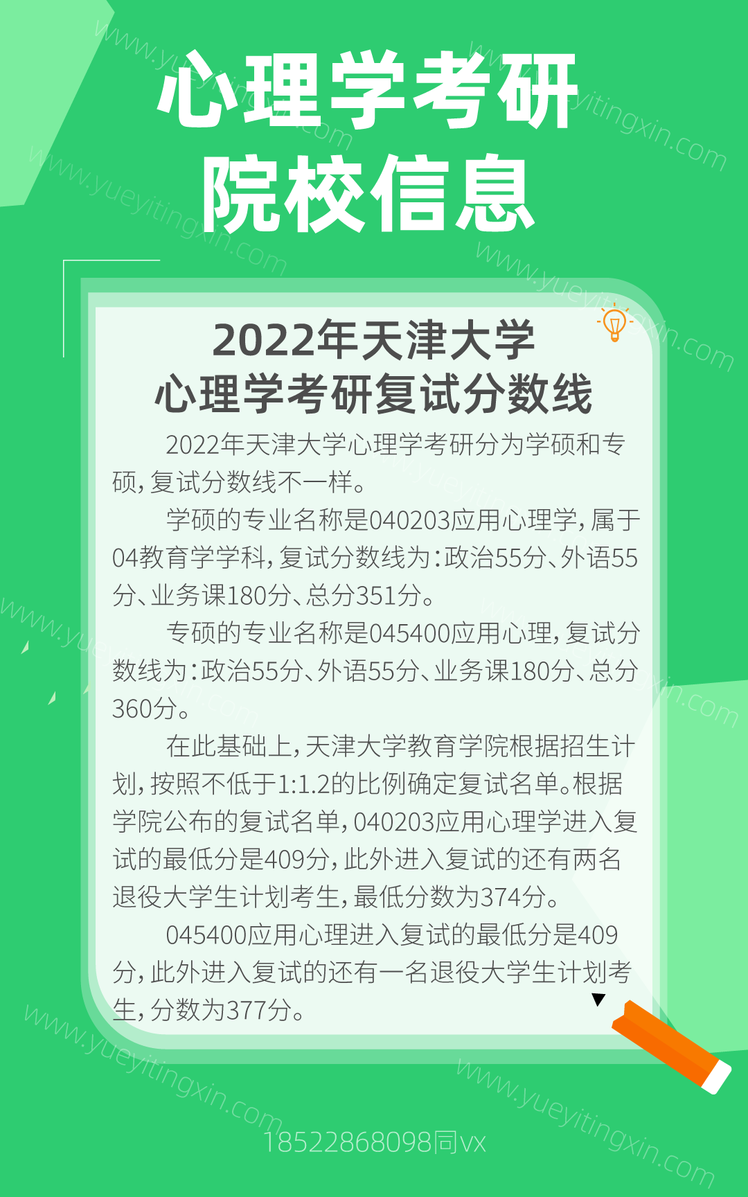 2022年天津大学心理学考研分为学硕和专硕,复试分数线不一样。学硕的专业名称是040203应用心理学,属于04教育学学科,复试分数线为:政治55分、外语55分、业务课180分、总分351分。专硕的专业
